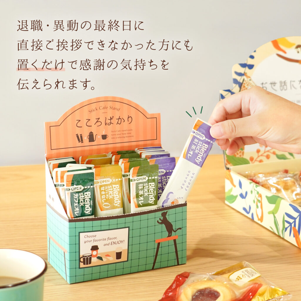 お湯を注ぐだけで手軽に楽しめるスティックタイプ。カフェオレ・紅茶オレ・抹茶オレなど、バラエティ豊かな味が揃っており、幅広い世代に喜ばれます。「こころばかり」という名前の通り、ちょっとしたお礼の気持ちを伝えるのにぴったりなデザイン。組み立て式の“カフェスタンド風ボックス”になっており、並べるだけで明るく楽しい雰囲気に。遊び心のあるパッケージと実用性を兼ね備えた、お礼ギフトに最適な一品です。