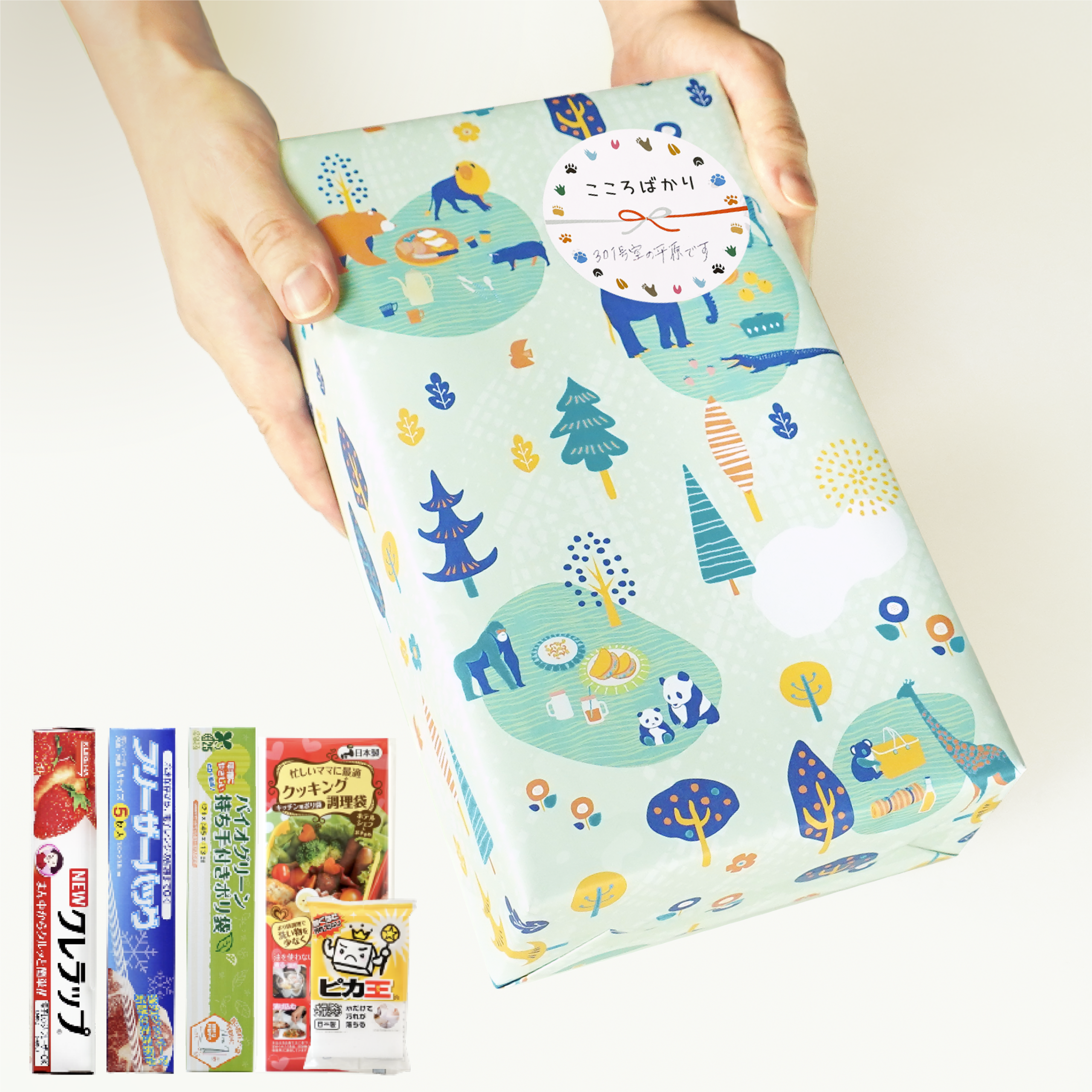 クレラップを含むキッチン用品5点セットを、北欧風の動物イラストが可愛い包装紙で包んだご挨拶ギフトです。