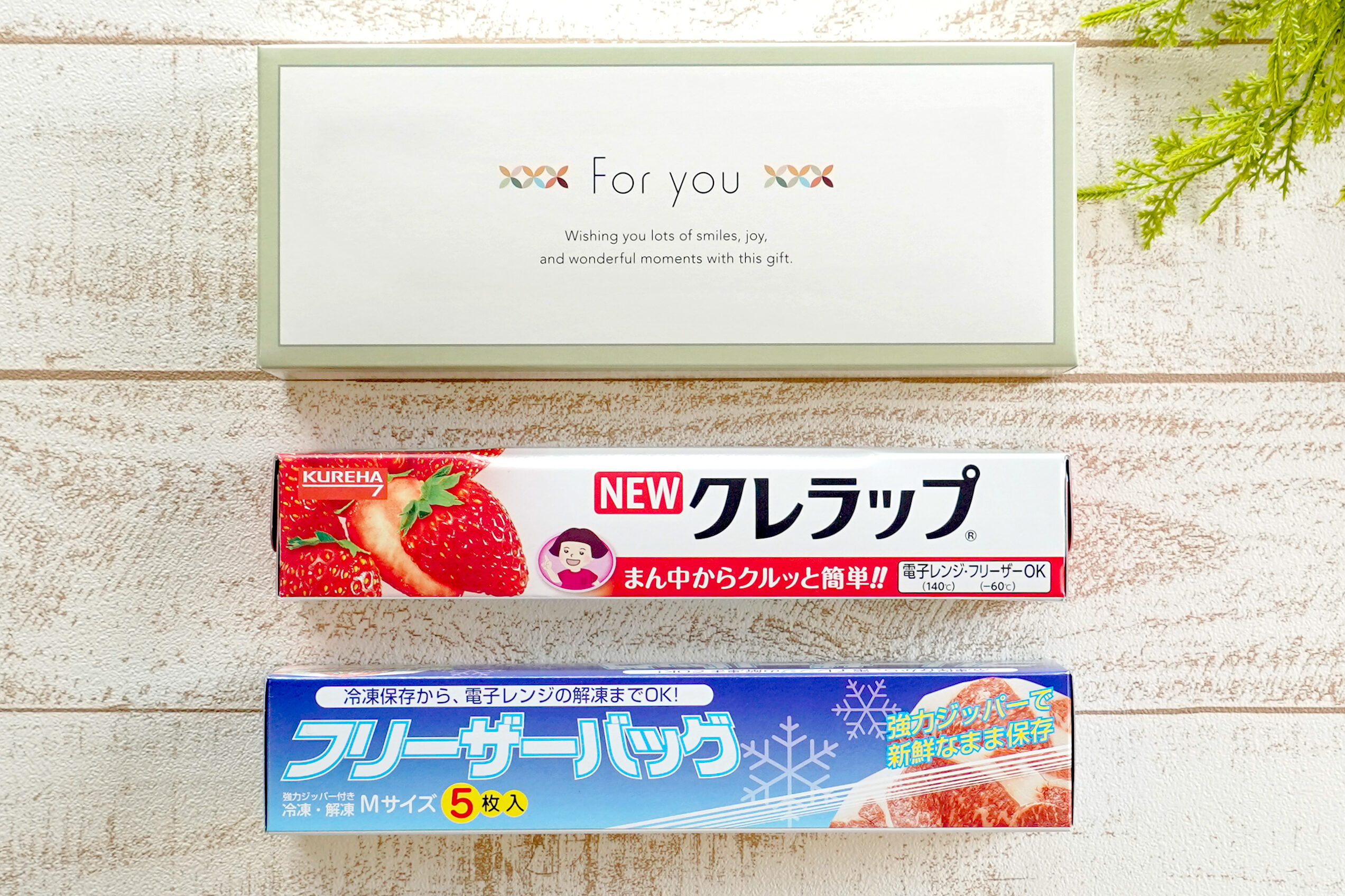 どんな方にもお渡ししやすく、ちょうどよい価格・サイズ感でおすすめしたいのが、クレラップとフリーザーバッグのギフトセットです。Motto Storeでは、包装紙を3種類ご用意していますので、お渡しする方の雰囲気に合わせてお選びいただけます。